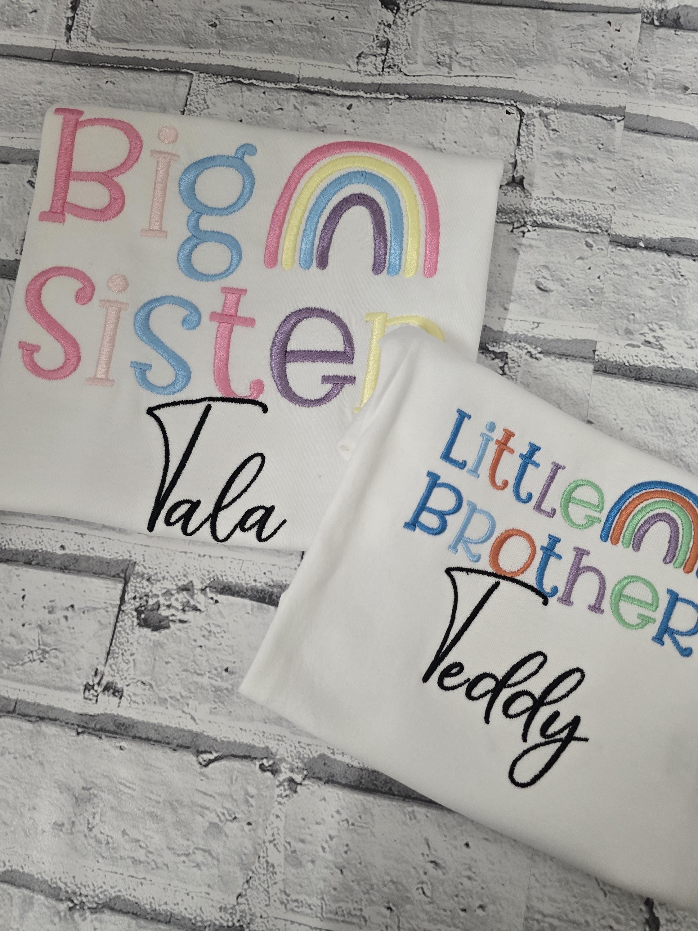 Embroidered in soft pastel shades, pinks for sisters blues for brother, each come with rainbow design and name of choice.