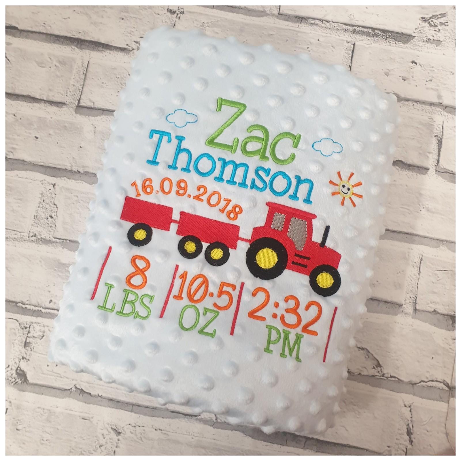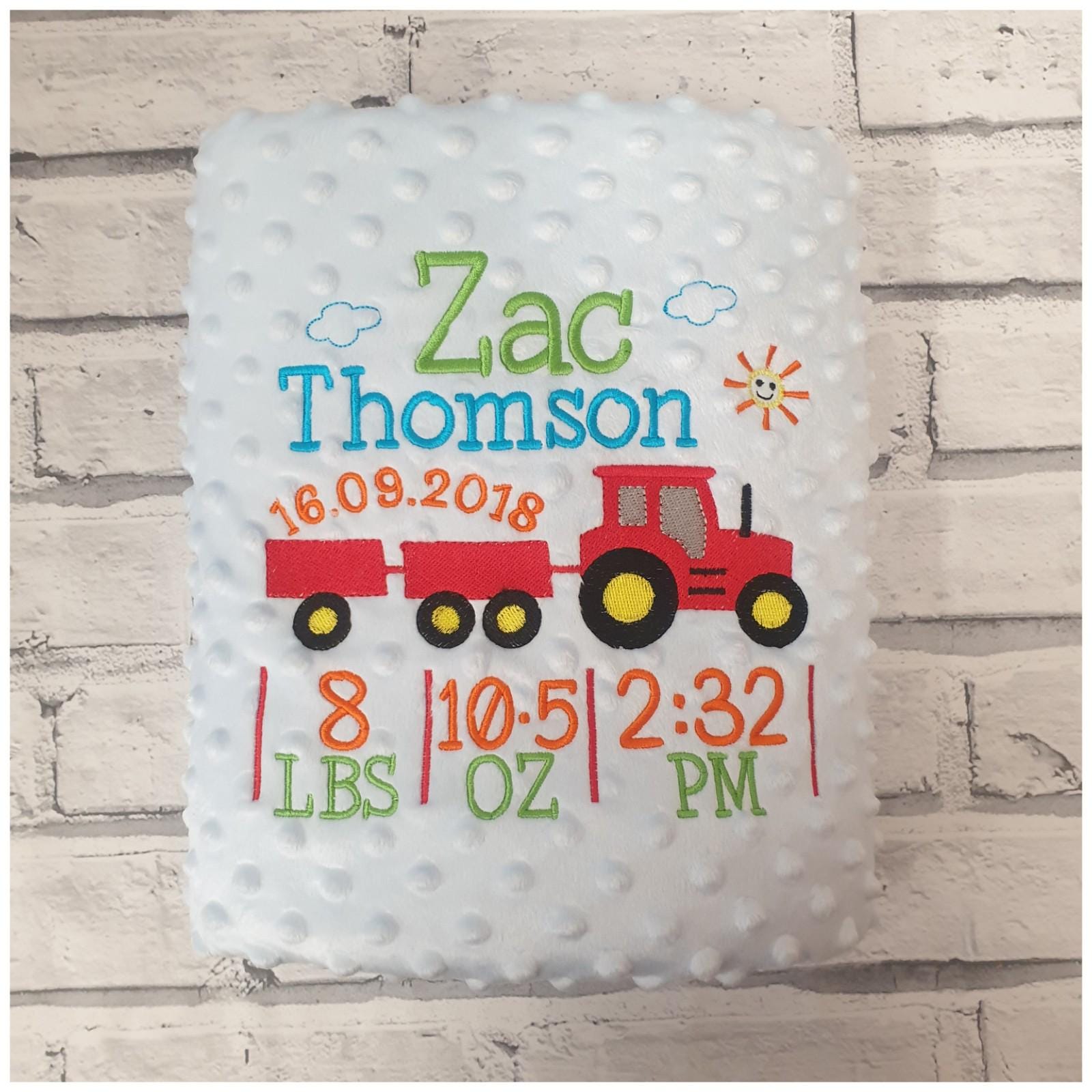 Beautifully embroidered with tractor design and baby's details.
