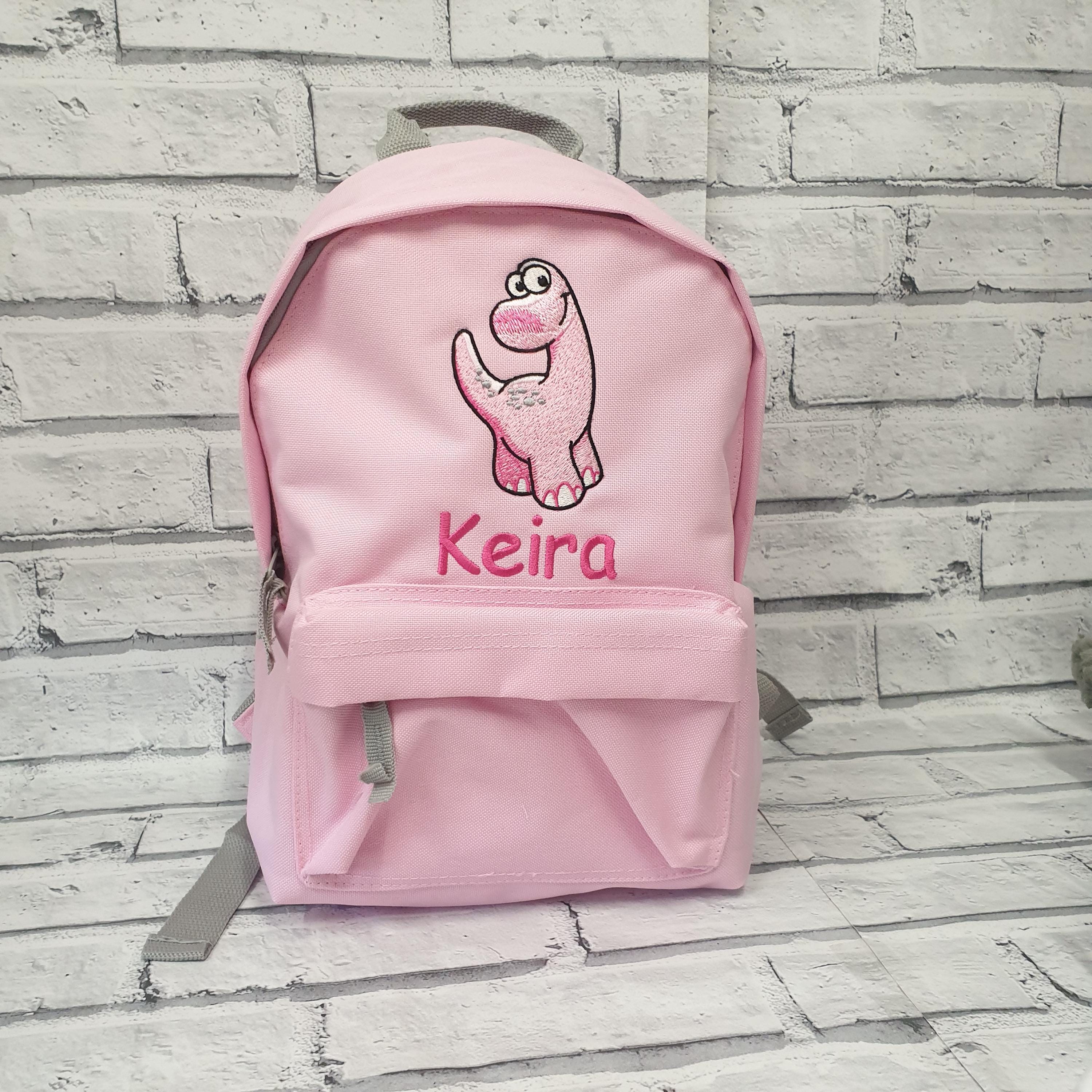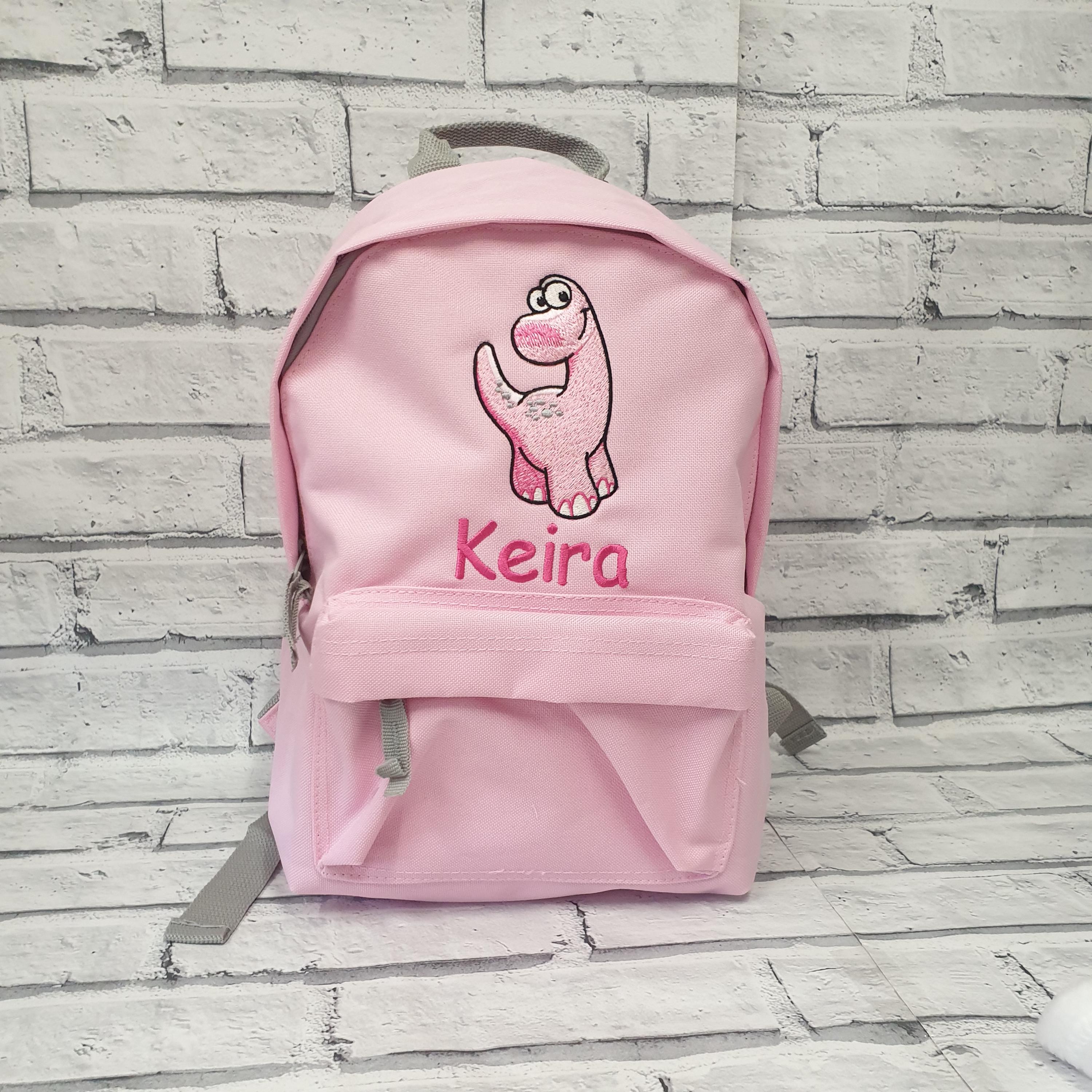 This cute personalised embroidered dinosaur backpack is available in 2 sizes