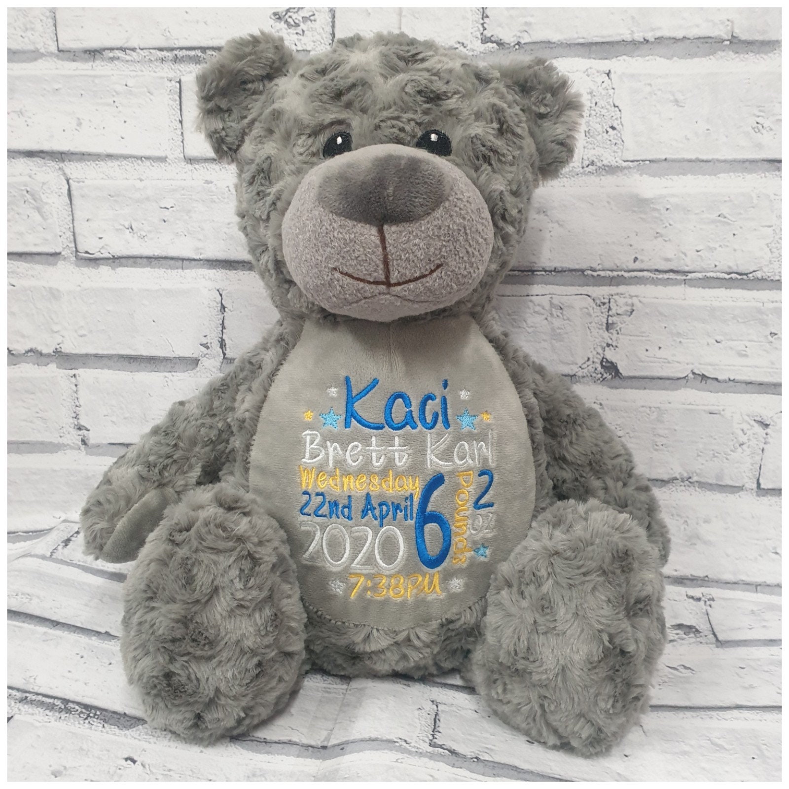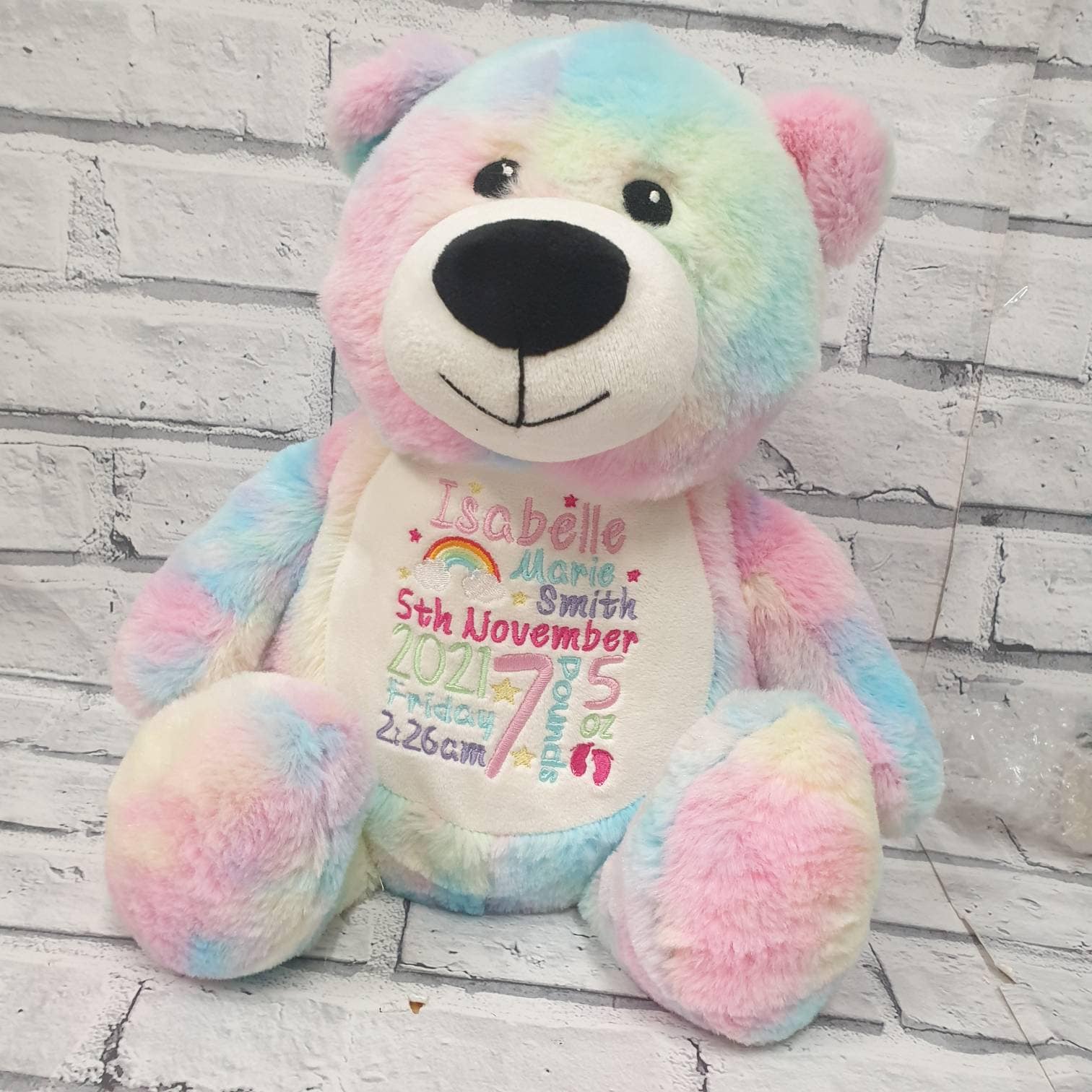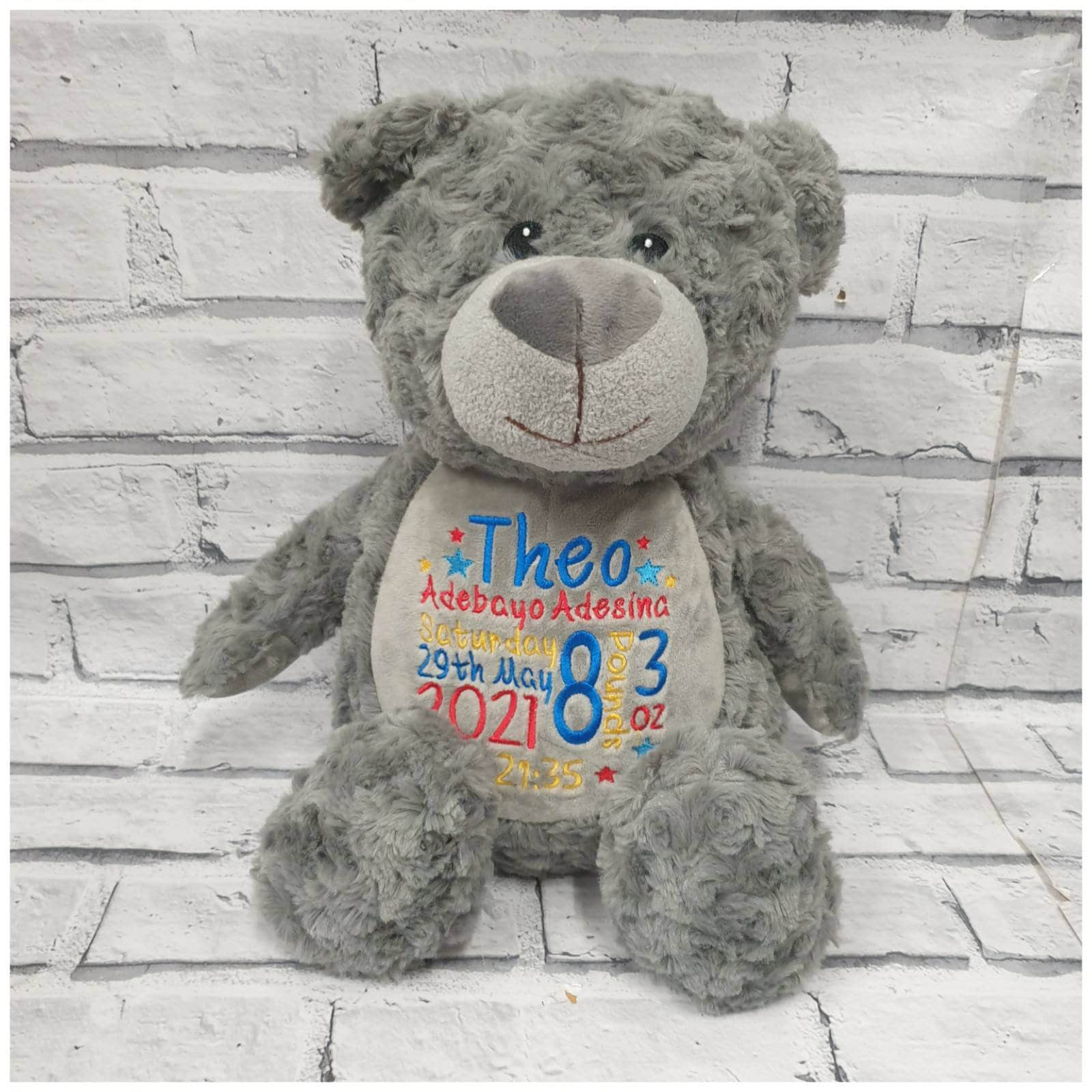 You can have any text you like embroidered onto the tummy but the most popular for new baby's is the birth block shown in the advert. You can choose any colour combination you like 3 or more is best or i can pick appropriate colours for you.