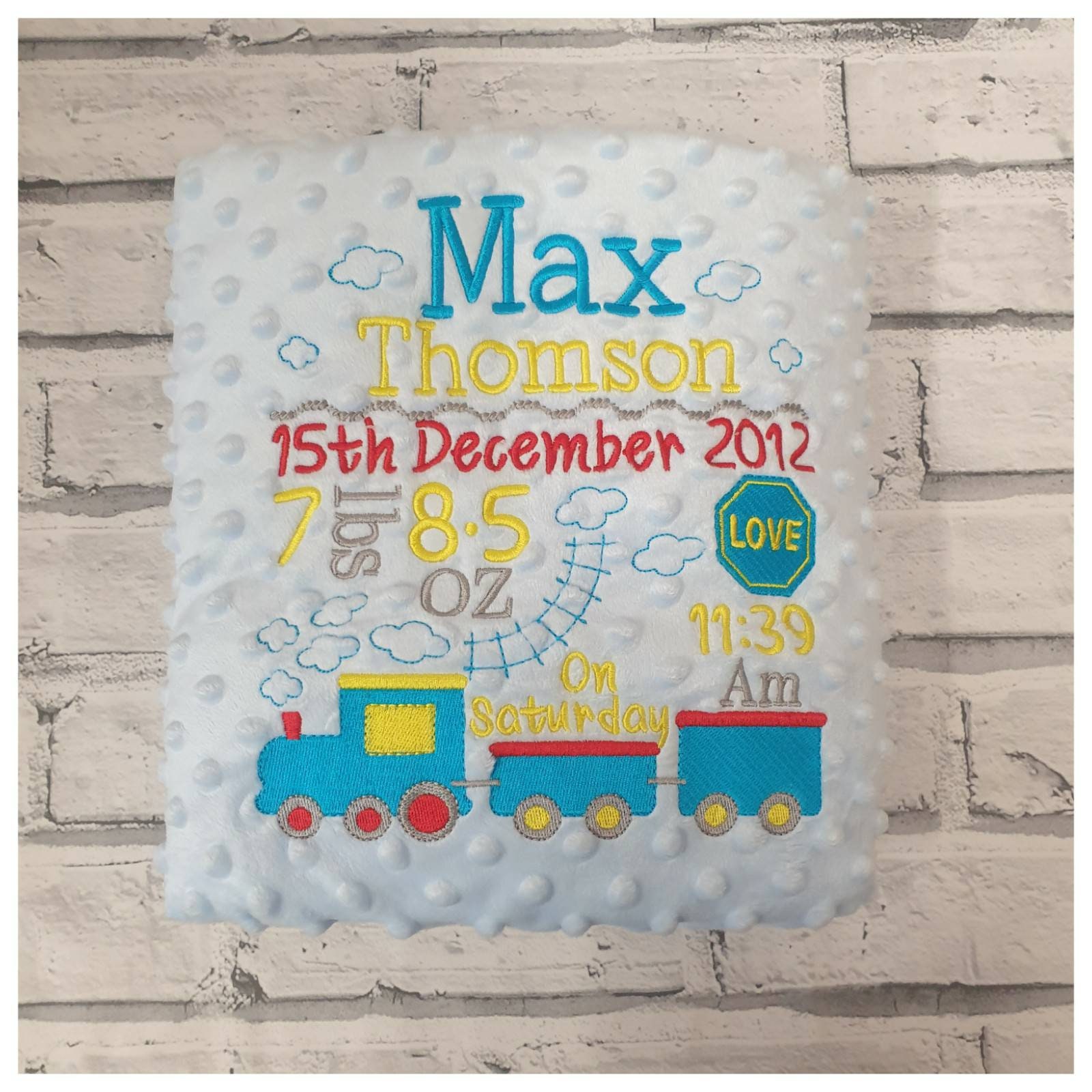 This lovely dimple blanket is beautifully embroidered with train design and baby's details.