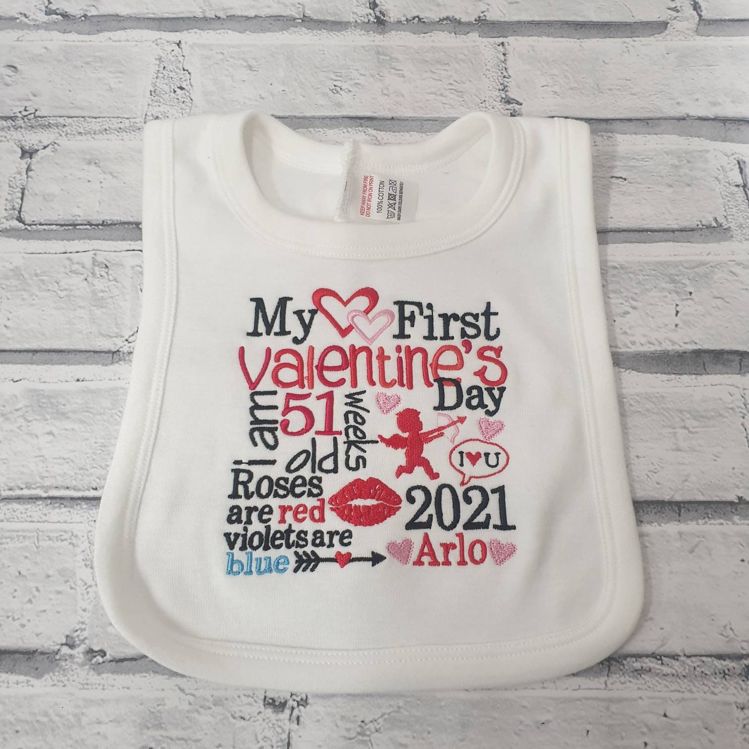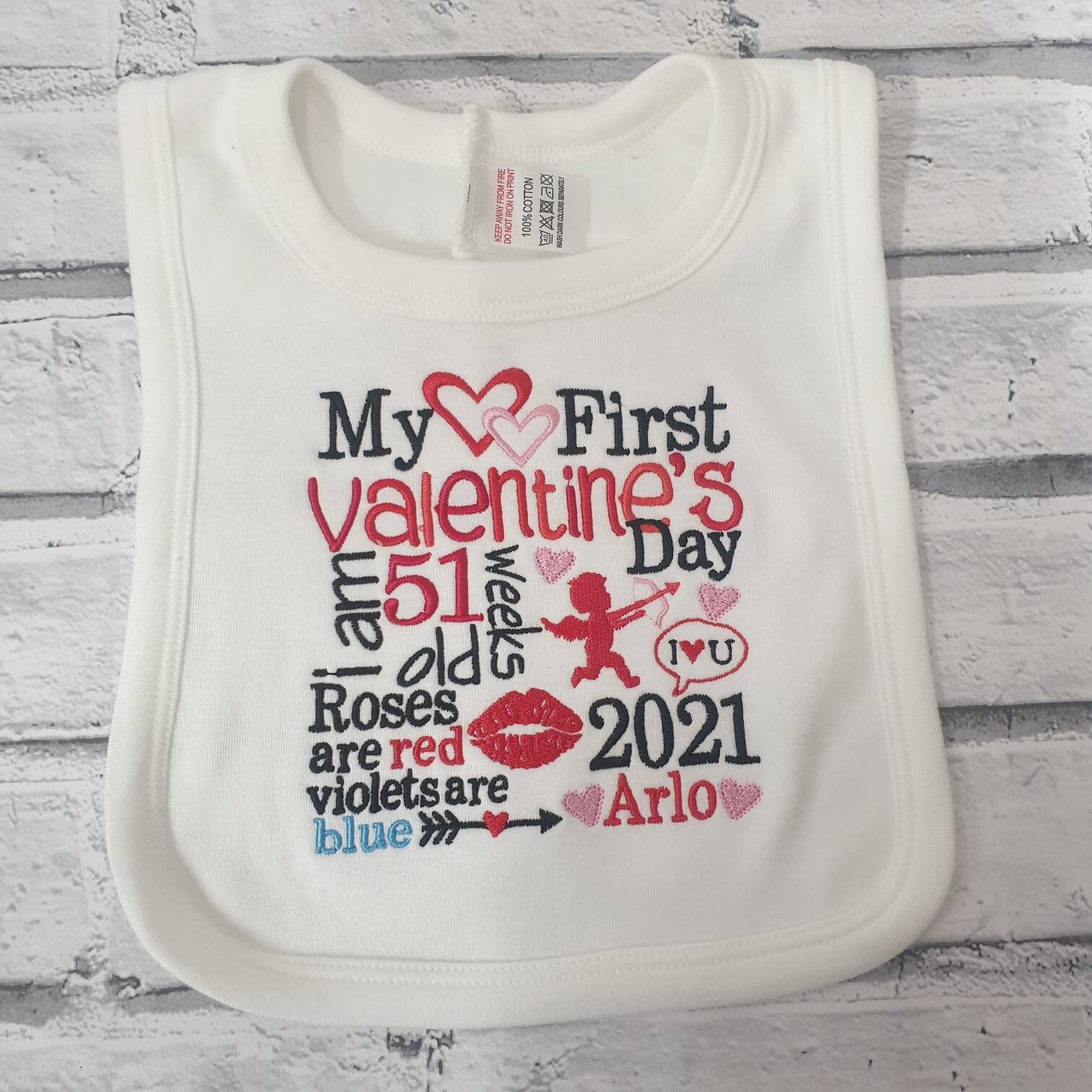 Embroidered with Baby's name and how many week or months the baby is in hot reds and black.