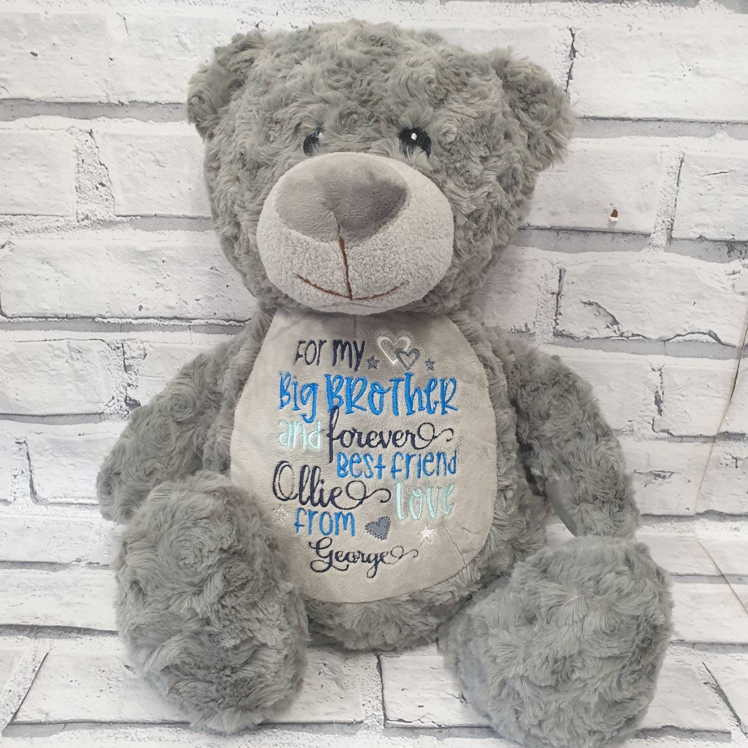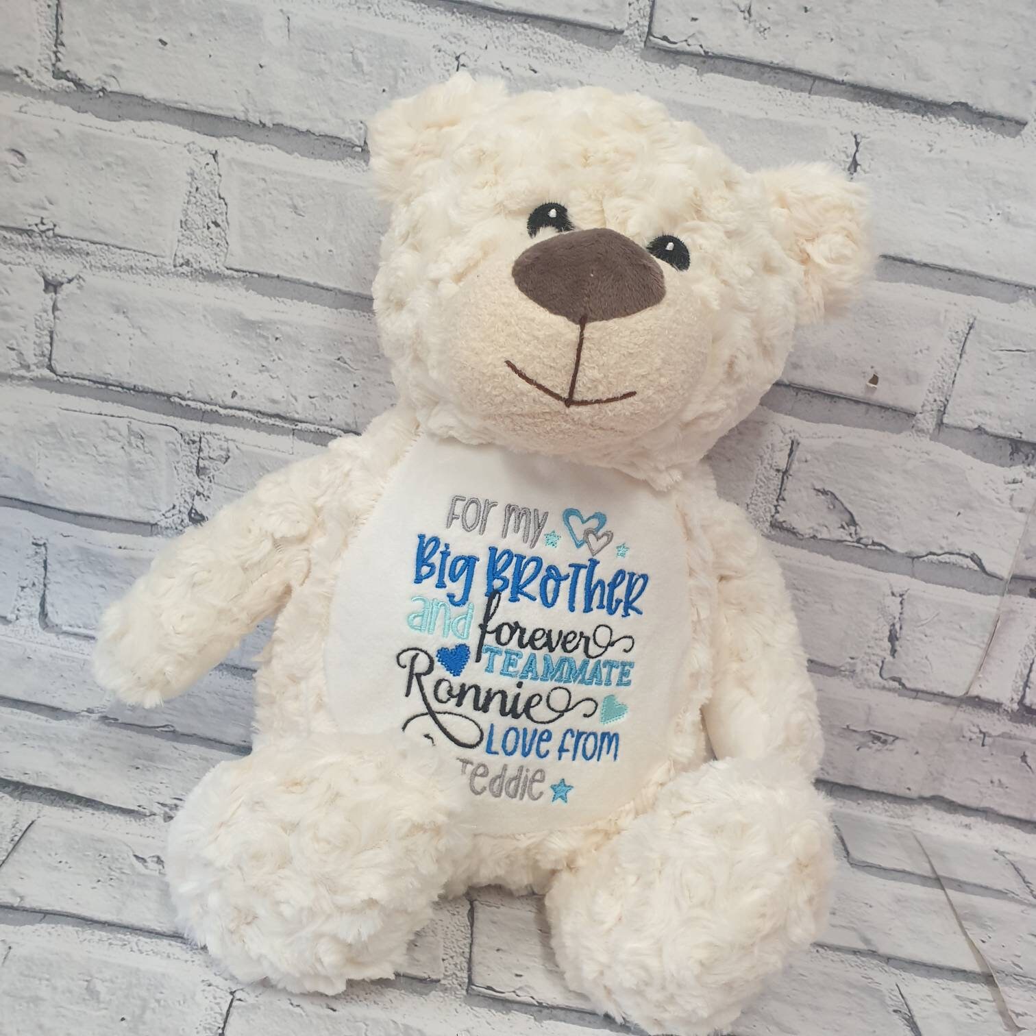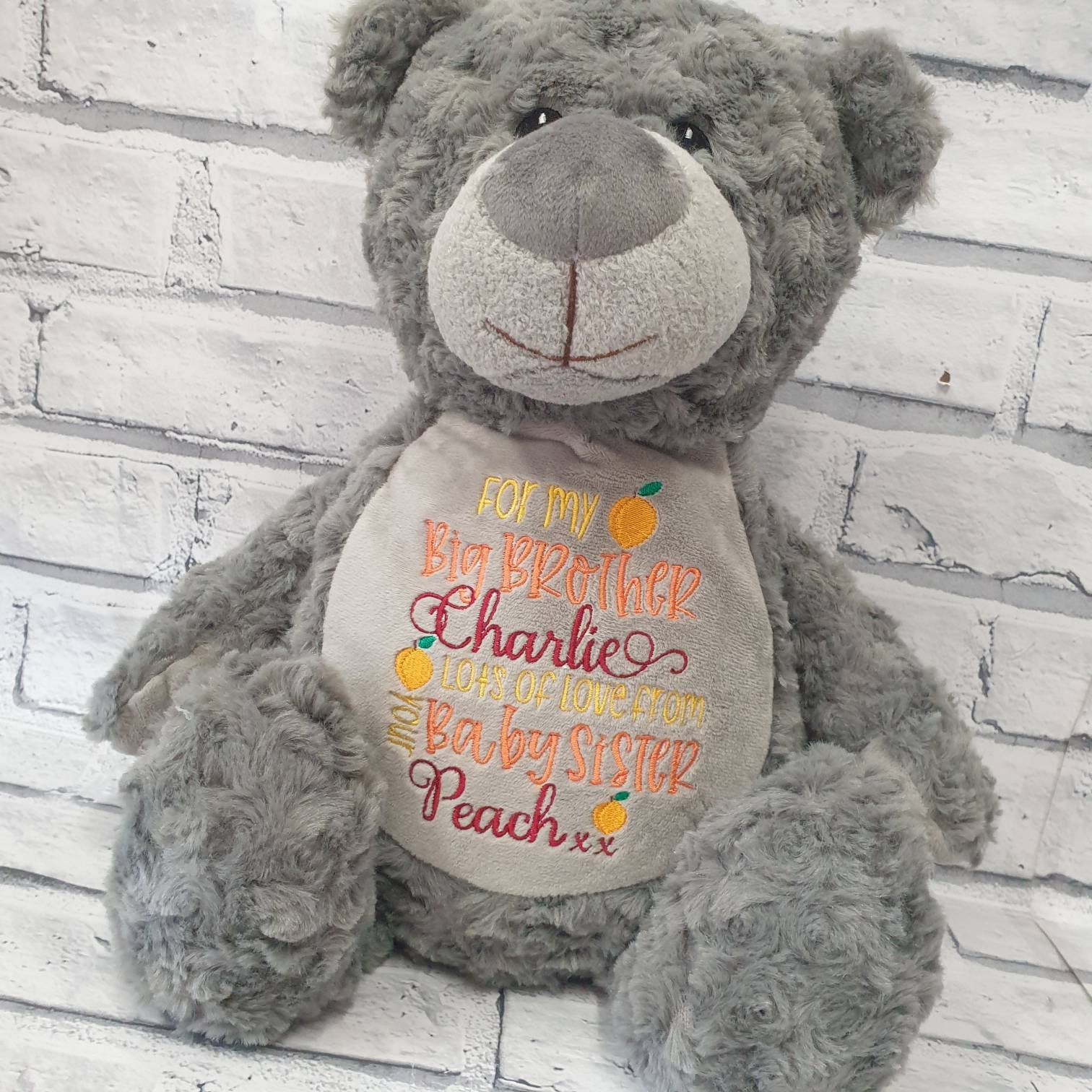 Beautiful cream or grey teddy bear embroidered with your choice of text or birth announcement.