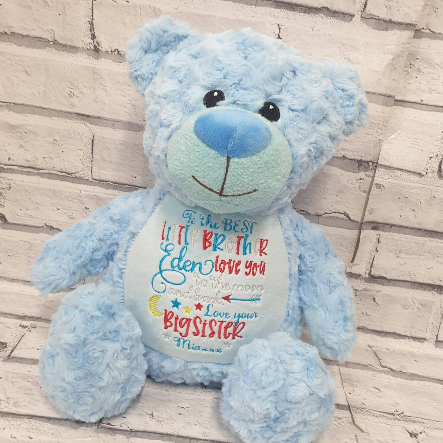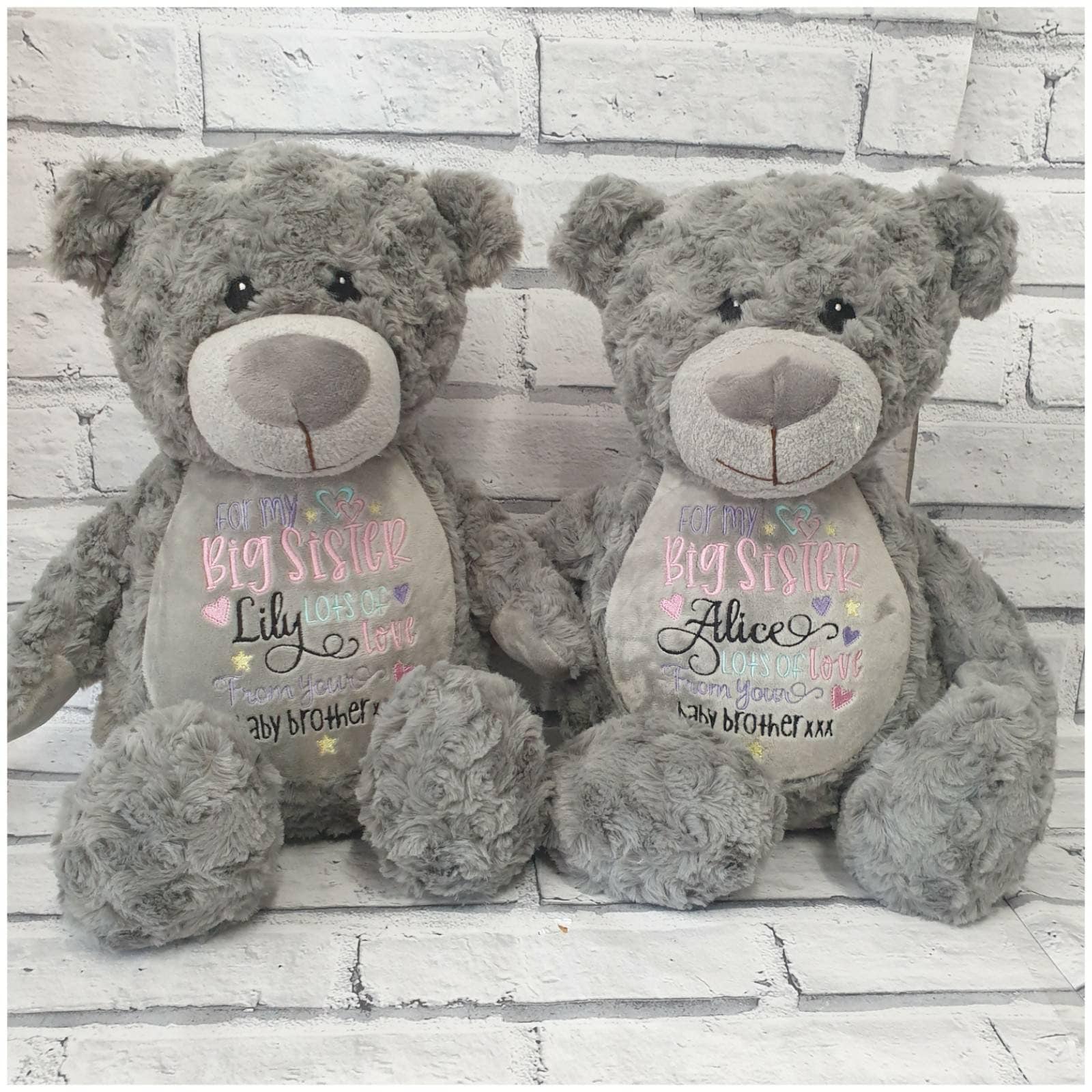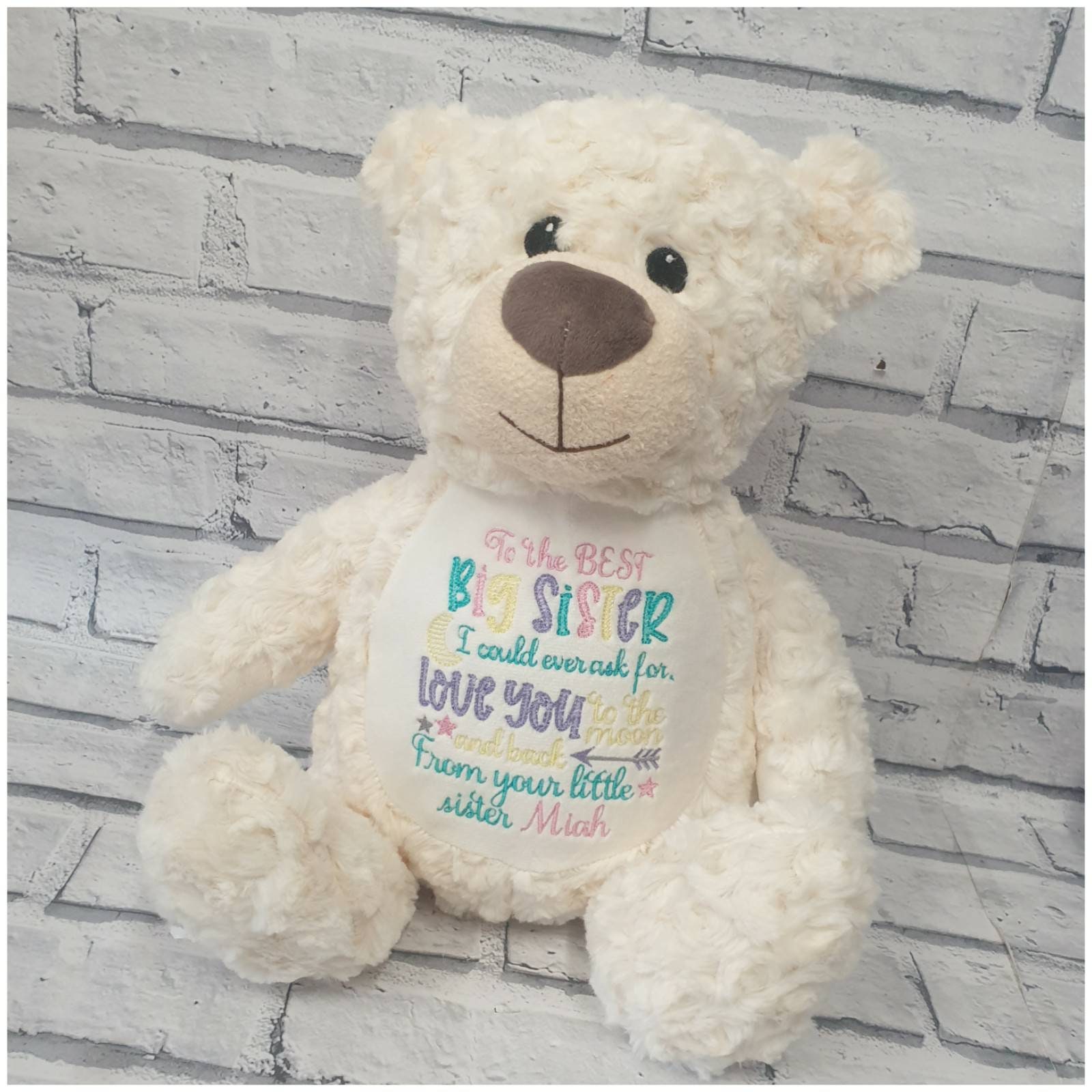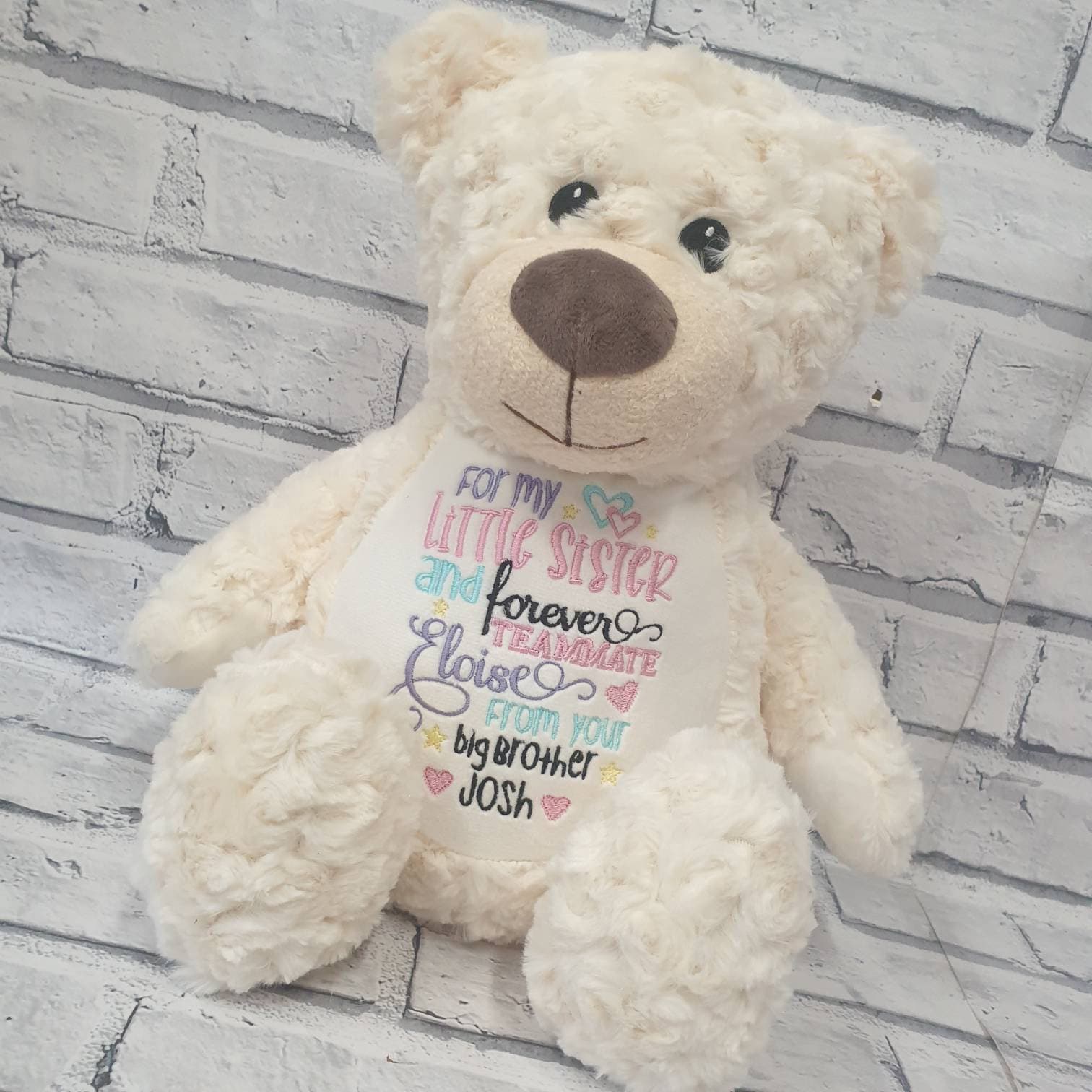 Beautiful cream or grey teddy bear embroidered with your choice of text or birth announcement.